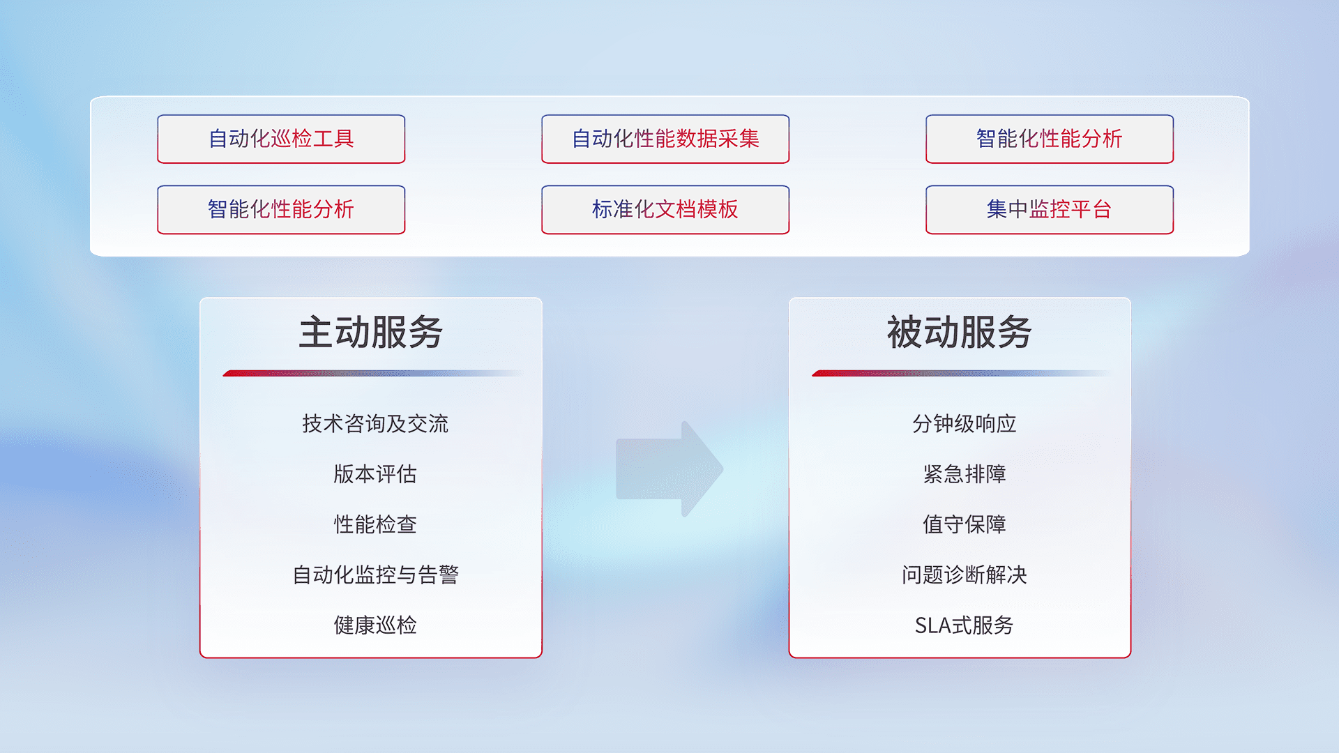 智能化工具和标准化文档,,,保障服务质量,,提供主动服务(包含技术咨询、、、版本评估、、性能检查、、、、自动化监控与告警、、健康巡检)和被动服务包含(分钟级响应、、紧急排障、、、、值守保障、、、问题诊断解决、、、SLA服务)。。。